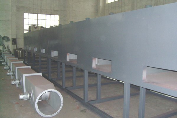 物料由加料器均匀地铺在网带上,网带一般采用12-60目不锈钢丝网,由传动装置拖动在干燥机内移动。干燥机由若干单元组成,每一单元热风独立循环,部分尾气由专门排湿风机排出,废气由调节阀控制,热气由下往上或由上往下穿过铺满物料的网带完成热量与质量传递的进程,带走物料水份。网带缓慢移动,运行速度可根据物料温度自由调节,干燥后的成品连续落入收料器中。上下循环单元根据用户需要可灵活配备,单元数量亦可根据需要选取。