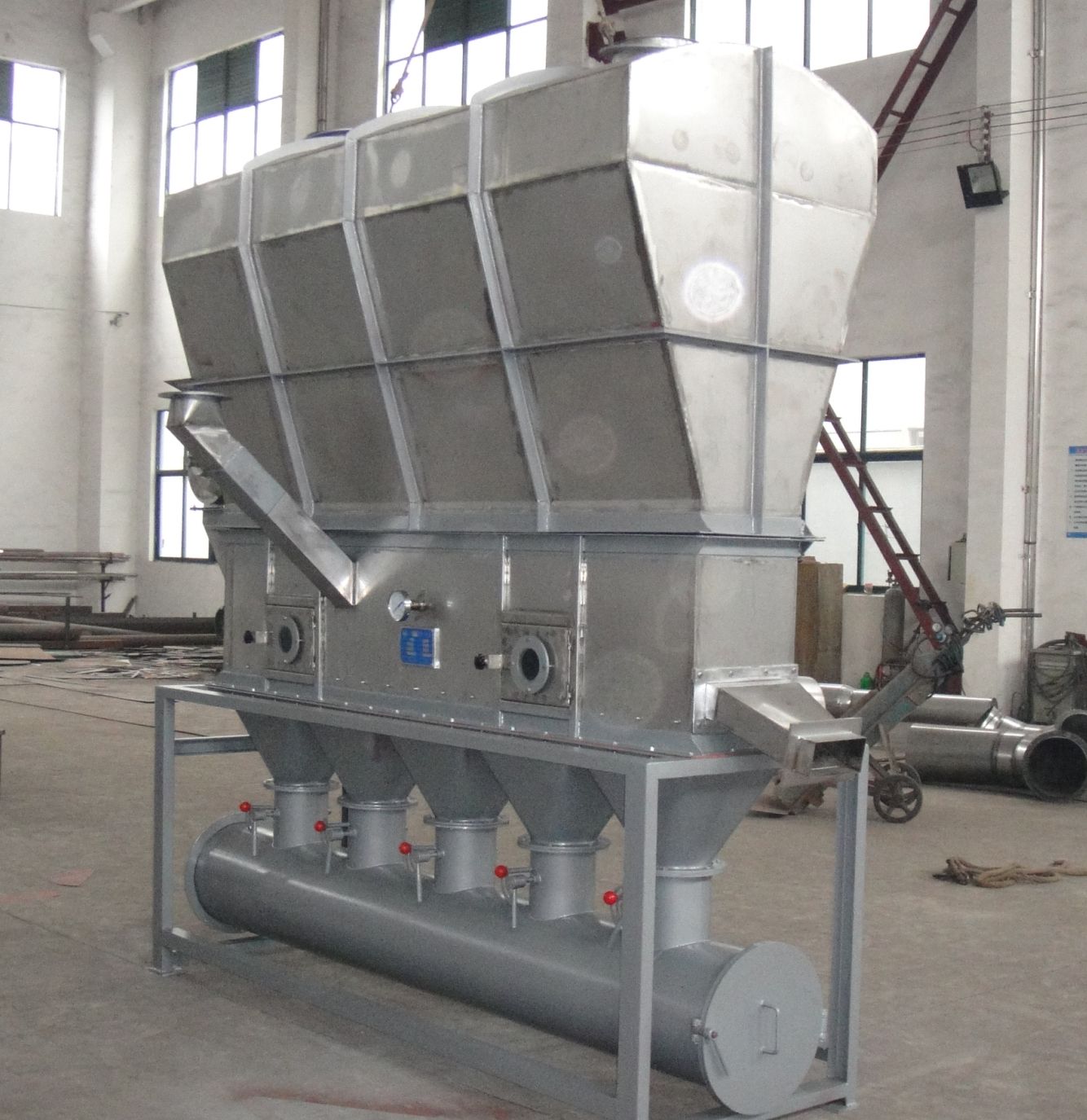 沸腾床干燥机可实行自动化生产,是连续式干燥设备。干燥速度快,温度低,能保证产品质量,符合药品生产GMP要求,蒸汽、电、热风炉均可配用。